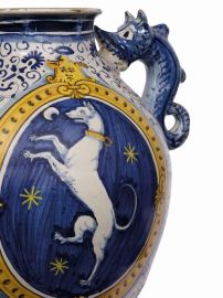 Per la morfologia delle anse del tipo “draghiforme”, o a delfino, con la coda chiusa a formare un occhiello sono noti nove esemplari di produzione montelupina con emblema della famiglia fiorentina Aldobrandini di Lippo, dei quali quello datato 1541 già in collezione Beit (4).