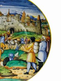Il ceramista s’ispira fedelmente alla scena dell’incisione adattandola alla superficie del piatto, come spesso accadeva nella bottega dei Fontana, una delle più prolifiche della città ducale, che a partire dal 1540 vanta una notevole produzione grazie all’opera di molti pittori, al punto che non è tuttora possibile distinguere gli apporti di ciascun artista. Il pittore del piatto in esame è comunque un buon conoscitore dell’antico testamento, tanto che sono numerosi gli esemplari accostabili a quest’opera. Ad esempio un utile confronto ci viene da un piatto di recente pubblicazione del Metropolitan Museum di New York, raffigurante la costruzione della torre di Babele (3).