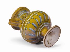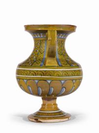 Numerosi esemplari sono conservati nelle collezioni pubbliche di grandi musei e in collezioni private, caratterizzati da decorazioni geometriche o fitomorfe, talvolta con la presenza di medaglioni con ritratti amatori, che ne attesterebbero l’uso di gamelio. Si vedano come confronto gli esemplari pubblicati dalla Giacomotti nel regesto dei musei francesi (4), ed in particolare il vaso del museo del Louvre con motivo floreale sul corpo, databile al primo terzo del XVI secolo, e gli esemplari a lui vicini. Più prossimo al nostro esemplare il vaso biansato pubblicato da Giovanni Conti della collezione Bellini di Firenze, caratterizzato da un analogo decoro con piccole varianti con decori in blu e lustro oro (5). Si vedano anche il vaso della raccolta di ceramiche del Museo d’Arti Applicate del Castello Sforzesco di Milano (6), databile anch’esso in pieno Cinquecento e molto vicino al nostro esemplare per modalità decorative, e quello della Pinacoteca di Varallo Sesia della collezione Franchi (7). Un ultimo confronto, che mostra la medesima scelta decorativa, ci viene fornito dalla collezione del museo di Berlino (8): esso mostra analoga decorazione a embricazioni o squame sul corpo, ma propone un motivo floreale al posto delle “bacellature oblique” nella parte inferiore del corpo.