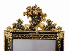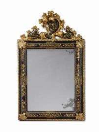 Alla ricchezza pittorica corrisponde una equivalente vivacità scultorea che si esprime, oltre che nel realizzare le cornici nelle fogge più svariate e ricche, nel fregiarle di elementi in legno intagliato. Ai quattro lati esterni della cornice vengono spesso applicati inserti in legno scolpito e dorato, presente nella nostra coppia in foggia di motivo ogivale, a creare una sorta di controcornice atta a far risaltare con forza la specchiera sul muro. Ma importanza maggiore è certamente affidata alla cimasa, irrinunciabile coronamento della parte superiore dello specchio, nel cui intaglio la fantasia dei maestri veneziani mette in mostra tutto il proprio repertorio di foglie, conchiglie, festoni e, come nel nostro caso, cartigli, spesso realizzati per contenere al proprio interno lo stemma di famiglia o, nelle specchiere qui proposte, decorato con i medesimi motivi pittorici arricchiti di madreperla che si riscontrano anche sul corpo.
