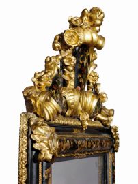 Quasi in risposta ai motivi floreali dipinti, la cimasa si popola di elementi in legno dipinto e intagliato con una maestria che ben compete con quella degli esperti e fantasiosi maestri “depentori”: nelle nostre specchiere, fiori e frutti alternati a volute fogliacee inquadrano la cimasa centrale, la cui posizione asimmetrica crea quell’effetto di decentramento tipico del secondo quarto del secolo XVIII, mentre i quattro angoli delle cornici sono segnati, stavolta simmetricamente, da piccole cartelle scolpite e illuminate al centro dalla madreperla. E se spesso in questa tipologia di specchiere l’elemento scultoreo sembra prevalere su quello pittorico, concentrando nella cimasa il punto focale dove l’attenzione va a fissarsi, nei nostri esemplari a caratterizzare la composizione è un grande equilibrio, in cui tutti gli elementi, scultorei e pittorici, convivono a creare un complesso armonioso.