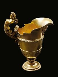 Il versatoio poggia su base circolare con profilo baccellato. Il corpo ha il la parte inferiore ornata da foglie e la parte centrale decorata da stemma araldico inciso tra serti vegetali. La fascia sovrastante presenta un volto di putto incorniciato da una foglia. La presa è finemente modellata come una sirena