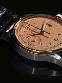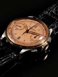 Cassa in acciaio con fondello a scatto, lunetta e corona in oro rosa 18 kt, pulsanti cronografici rettangolari. Quadrante rosè con indici e numeri arabi applicati oro, scala tachimetrica e divisione dei cinque minuti periferiche, due quadranti ausiliari ad ore 3 e 9 rispettivamente con registro dei 30 minuti e secondi continui, lancette a foglia oro, secondi cronografici neri al centro. Movimento a carica manuale calibro 13''', cassa, quadrante e movimento firmati