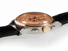 circular stainless steel case with 18 K pink gold bezel, gold crown, stainless steel snap on back, two rectangular chronograph buttons in the band. Pink dial, applied gold baton and Arabic numerals, outer hard enamel five minute divisions and tachymetre scale, two subsidiary dials for constant seconds and 30 minutes register Patek Philippe. Cal. 13''' mechanical movement, case, dial and movement signed