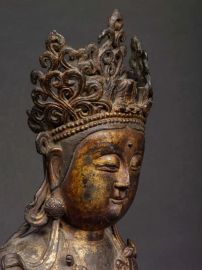 La testa della divinità è sormontata dalla nobile corona, decorata con la figura del Buddha Trascendente Amitābha in posizione Padmasana.