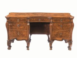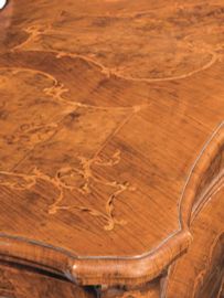 Essa è sorretta da otto robusti piedi finemente intagliati a volute intrecciate, da cui partono otto montanti bombati che ammorbidiscono il mobile eliminandone gli angoli e terminano con raffinati riccioli su cui appoggia il piano, sagomato e con bordura a becco di civetta. Di forma “a cattedra”, questa scrivania offre quattro grandi cassetti oltre a tre più piccoli nella fascia ed è decorata su tutti i lati, sui montanti e sul piano, da eleganti riquadri intarsiati che incorniciano la radica di noce negli spazi grandi mentre decorano gli spazi più piccoli. Questi intarsi, eseguiti in legno di bosso con motivi di rocaille sfrangiate, sono da riferire al decoro “a pelle di rapa” usato in Lombardia e di derivazione austro tedesca. Sul fronte presenta al centro uno stemma gentilizio, senz’altro da riferirsi alla committente originale.