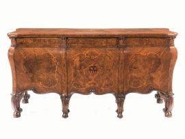 impiallacciata in noce e radica di noce, di forma mossa e bombata, quattro grandi cassetti più tre sulla fascia, su otto piedi in legno di noce intagliato, cm 84x164x77