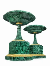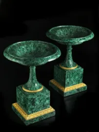 Gli oggetti in malachite caratterizzano il ricco e raffinato gusto d’inizio XIX secolo in Russia. I maestri-artigiani lavoravano questo materiale con la tecnica del “mosaico russo”, la tagliavano cioè in piccole placche che poi univano insieme e lucidavano, creando l’illusione che l’oggetto provenisse da un unico blocco, grazie anche al fine gioco di linee ottenuto dalle venature della pietra. Spesso questi manufatti venivano abbelliti con ricche montature in bronzo dorato, creando dei fantastici effetti di luci e contrasti.