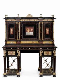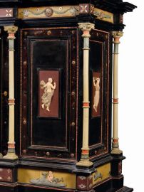 L’elenco di esempi sarebbe ancora nutrito ma vorremmo almeno qui ricordare i casi più prossimi per data come l’edificazione, compiuta nel 1891, dell’Achilleion di Corfù per l’Imperatrice Elisabetta d’Austria, ad opera dei napoletani Raffaele Carito e Antonio Landi, o la costruzione della Villa Kerylos per Theodor Reinach a Beaulieu-sur-Mer, su progetti di Emmanuel Pontremoli, edificata ai primi del Novecento. In quest’ultimo edificio compaiono diversi arredi ispirati, come nel caso del nostro Stipo, al gusto pompeiano ma rivisti in una chiave scenografica con vaghe citazioni dalle fonti. Sul nostro scrittoio, ad esempio, le figure allusive alle Stagioni sono tratte più o meno fedelmente da una serie di pitture ritrovate nel Settecento ad Ercolano e da allora adoperata su mobili e porcellane, come era accaduto nelle pitture e negli arredi della Villa Favorita a Resina, in cui vennero impiegate per decorare un gruppo di arredi fra cui alcune poltrone e un divano oggi a Capodimonte, tutte opere databili fra la fine del Settecento e i primissimi anni del nuovo secolo (9).