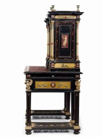 Il Catalogo generale dell’Esposizione nazionale di Palermo del 1891 descrive i numerosi manufatti presentati dalla Regia Scuola di Torre del Greco a quella manifestazione. Non si trattava solo di oggetti in corallo, essi comprendevano infatti svariati album di disegni di ornato, fogli di architettura e meccanica, alcuni modelli in gesso, creta, cera, sessantotto pezzi incisi in corallo, lava, madreperla, conchiglia, avorio o legno, diversi manufatti e infine uno “scrittoio con stipo, in stile pompeiano, in ebano con decorazioni di corallo, lava, tartaruga e madreperla incisa” (1). Alcune foto dell’epoca (2) mostrano il nostro scrittoio e un gruppo di altri mobili, due poltrone e un tavolo scrivania, eseguiti con la stessa tecnica e lo stesso stile e presentati all’Esposizione Nazionale di Torino del 1898.