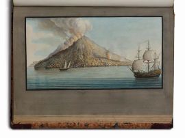 In folio (460 x 335 mm). Frontespizio tipografico; mappa della Baia di Napoli a doppia pagina, incisa nel 1776 da Giuseppe Guerra su disegno di Pietro Fabris e colorata a mano; [1] carta con "References to Plate I"; frontespizio calcografico colorato a mano, raffigurante sei quadretti con le Isole Eolie; pp. 3-90; [1] carta con licenza; frontespizio tipografico; [53] carte di testo alternate a [53] tavole calcografiche numerate II-LIIII e colorate a mano; frontespizio tipografico del Supplement; [1] carta con "References to Plate I"; frontespizio calcografico colorato a mano, raffigurante sei quadretti con l'eruzione del Vesuvio; pp. 1-29 [1]; [1] carta con la dedica a Ferdinando IV; [4] carte di testo alternate a [4] tavole calcografiche numerate II-V e colorate a mano. Completo. Legatura coeva in mezzo marocchino rosso a grana lunga con angoli, dorso a sei nervi e sette scomparti con fine decorazione dorata, titoli in oro al secondo scomparto, piatti, tagli e sguardie marmorizzati, rotella di fiori e foglie dorati ai piatti. Pagine occasionalmente ingiallite e tracce del tempo alla legatura, ma nel complesso copia ottima.