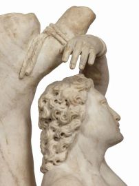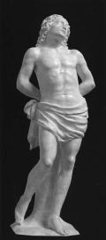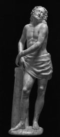 Si tratta, in primo luogo, di un’altra immagine di San Sebastiano, ma con entrambe le mani legate dietro la schiena, e di un Cristo alla colonna, opere conservate nelle raccolte d’arte del Castello Sforzesco a Milano (Zani, op. cit. 2014, pp. 76-79, nn. 878-879) e riferite al Solari, pur col dovuto “margine di dubbio”, da Maria Teresa Fiorio (in Il Genio e le Passioni. Leonardo e il Cenacolo. Precedenti, innovazioni, riflessi di un capolavoro, catalogo della mostra, Milano, Palazzo Reale, Milano 2001, pp. 250-251, nn. 90-91, dove ribadisce quanto già avanzato in un articolo del 1994) che proponeva cautamente di identificarle nei Santi Nazaro e Celso immaginando provenissero da un medesimo altare. A queste lo stesso Zani (op. cit. 2003) ebbe modo di aggiungere un’altra statuetta, al tempo presso la galleria Botticelli di Firenze, raffigurante il Cristo alla colonna, versione in controparte di quella del Castello e “senza alcuna incertezza” scolpita dal “medesimo artista” che lo studioso era incline a ritenere uno “scultore lombardo ligure” attivo nel terzo quarto decennio del Cinquecento, peraltro senza disconoscerne le tangenze coi modi di Cristoforo Solari e ricordando un documento del 1511 che ne attesta i rapporti con la committenza genovese. Fu proprio in una postilla a questo medesimo contributo che Zani segnalò per la prima volta l’opera in esame, della quale sottolineava la consonanza coi modi del maestro milanese ravvisabile nella “formula compositiva che si richiama molto strettamente alla statua di San Sebastiano nel duomo di Milano, firmata da Cristoforo Solari” - databile sulla metà del secondo decennio - scoperta da Susanna Zanuso (Cristoforo Solari tra Milano e Venezia, in “Nuovi Studi”, V, 2000, 8, pp. 17-33). Il suo “carattere più marcatamente solariano” rispetto alle altre statuette del gruppo è stato poi confermato da Zani (op. cit. 2014, p. 78) nella recente scheda sui due marmi del Castello Sforzesco, dove inoltre aggiungeva alla serie un terzo San Sebastiano (Milano, collezione Giulini) “uguale” alla versione conservata nel museo milanese, opera che pertanto veniva a costituire col Cristo alla colonna della galleria Botticelli un’analoga coppia.