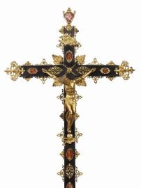 in legno ebanizzato, bronzo dorato e pietre dure; base a prospetto architettonico impreziosita da applicazioni in pietre dure entro cornici in bronzo dorato, agli angoli leoni accucciati e quattro busti di cherubini a tutto tondo; ai lati della croce, i due dolenti sono raffigurati a tutto tondo in bronzo dorato e volgono lo sguardo verso la croce impreziosita da applicazioni in bronzo cesellato e pietre dure e profilata da fiocchi e teste di cherubino in bronzo; finali dei bracci a volute traforati ai lati e con vaso sagomato in alto, cm 152x51x24