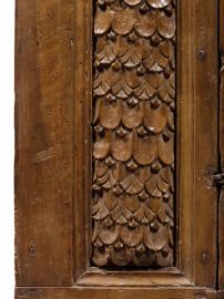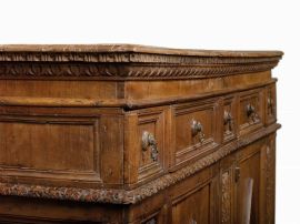 in noce intagliato, fronte a due sportelli inquadrati da lesene decorate con motivo a squame e centrati da losanghe che si ripetono anche sui fianchi; due cassetti appaiati sotto la fascia alternati ad altri tre cassetti più piccoli in corrispondenza delle lesene, fascia sottopiano scolpita con motivo a unghiature e a ovuli, cornice a foglie di acanto sotto i cassetti. Completa di pedana probabilmente non pertinente; cm 137x199x67, cm 18x212x90 la pedana
