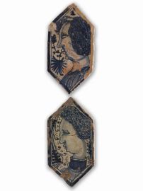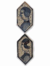 La prima mattonella reca un ritratto maschile dalla folta capigliatura portata corta, sopra le orecchie, affrontato da un ramo sottile con foglie di quercia, e trova preciso riscontro in alcune mattonelle del pavimento della Cappella Caracciolo nella basilica di San Giovanni in Carbonara a Napoli (Guido Donatone, che ha a lungo studiato questa produzione, ne propone l’identificazione con il ritratto di Leonello d’Este diffuso all’epoca grazie alla medaglia di Pisanello); la seconda invece un ritratto maschile dalla folta capigliatura che scende al di sotto delle orecchie, mentre una foglia di prezzemolo su un ramo sottile riempie la campitura di fronte al ritratto. La terza mattonella raffigura un profilo femminile con la capigliatura racchiusa in una reticella che trattiene i capelli sulla fronte, trattenuta da un cercine di stoffa, un filo di perle ne adorna il lungo collo mentre s’intravede l’abito accollato da cui emerge una camiciola a sottili piegoline; tutt’intorno una serie di punti riempiono le campiture vuote, così come nella quarta mattonella, raffigurante un profilo femminile con la capigliatura racchiusa in una reticella sul capo trattenuta da un cercine di stoffa che ne libera la fronte, e indosso un abito accollato con un giustacuore chiuso da una serie di piccoli bottoncini
