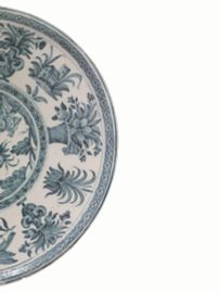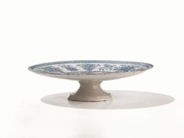 in maiolica dipinta in monocromia blu di cobalto con tocchi di bruno di manganese, medaglione centrale decorato con una scena di caccia ispirata dalle incisioni di Antonio Tempesta (1555-1630) incorniciata da una sequenza di elementi decorativi alternati: vasi di fiori, ciuffi vegetali, zolle con nuclei di edifici, uccelli e insetti. La monocromia turchina “alla maniera di Genova” è attestata a Castelli a partire dal 1670 circa. Molti frammenti in monocromia blu sono infatti emersi dallo scarico retrostante la bottega di Geronimo e Gabrilele Pompei, presso cui lavorarono per un certo periodo anche Berardino Gentili ed i suoi figli. Le affinità con tali frammenti e con alcuni altri esemplari di questa tipologia decorativa permettono di attribuire con certezza l’opera in esame alla bottega sopraindicata nell’ultimo ventennio del Seicento, diam. cm 28,5