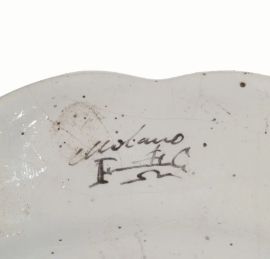 in maiolica dipinto con rosso, blu e giallo e verde a piccolo fuoco, orlo mistilineo profilato in bruno, centrato da un motivo figurato indicato nei documenti di inventario con la descrizione paesini e figure a smalto: un popolano è seduto su una zolla erbosa in riposo, mentre gli alberi fogliati dai caratteristici tronchi sinuosi fanno da quinta, con volatili e insetti. Marcato al verso in nero “Milano” e “FC” a frazione con decoro “4” al numeratore e omega al denominatore, diam. cm 23,5.