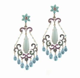 a chandelier, rispettivamente sui toni del rosa e dell'azzuro con elemento a fiore al quale sono sospese volute, cabochon centrale e gocce pendenti, decorati in smalti e pietre semipreziose taglio rotondo, cabochon e briolette, g 62