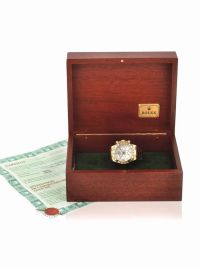 Cassa Oyster in tre corpi in oro lucido, fondello, corona e pulsanti cronografici a vite, lunetta con scala tachimetrica a 400 unità per ora, vetro zaffiro. Quadrante in madreperla con numeri arabi oro applicati ed indici con inserto in materiale luminescente, lancette a bastone oro, tre quadranti ausiliari ad ore 3,6, e 9 rispettivamente con registro dei 30 minuti, delle 12 ore e secondi continui, secondi cronografici al centro. Movimento a carica automatica calibro 4130. Cinturino in pelle, fibbia deployante in oro giallo 18 kt, cassa, quadrante, movimento e chiusura deployante firmati