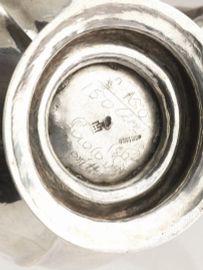 in argento, corpo piriforme bombato e sbalzato a costolonature oblique, presa in legno intagliato a volute, beccuccio zoomorfo, finale del coperchio realizzato a motivo vegetale, alt. cm 21, g 630