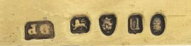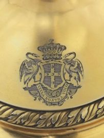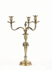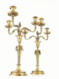 in vermeil, basi circolari decorate da stemma araldico dei Conti di Warwick con motto VIX EA NOSTRA VOCO, fusti scanalati e decorati da festoni, tre bracci ricurvi ed elemento centrale a bocciolo, le bobeches recano i bolli LONDRA,1798, ARGENTIERE JAMES STAMP e sono decorate anch'esse da parte dello stemma dei Conti di Warwick, alt. cm 60, complessivi g 6590 (2)