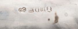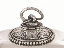 corpo in metallo argentato poggiante su quattro piedini a sfera schiacciata, vassoietto interno in argento, coperchio bombato in argento con presa realizzata a serpente, cm 36,5x22,5, g 2200 netti