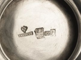corpo liscio a balaustro su base circolare, beccuccio a voluta, presa sagomata, finale del coperchio modellato a fiore, alt. cm 26,5, g 1160