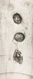 base tripode su piedini a sfera, tre sostegni uniti al corpo da busti femminili, bordo circolare traforato, coperchio con finale a fiamma, alt. cm 23,5, diam. cm 14,5, g 875