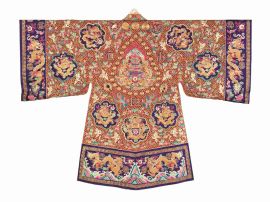 maestoso abito da cerimonia taoista fittamente ricamato a filo d'oro e colori policromi su sfondo blu e rosso a decoro di draghi, fenici e motivi floreali, reca nella fodera taglia ed anno di realizzazione, dim. cm 132x183