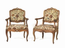 in legno intagliato, sedute e schienali rivestiti in tessuto a fondo écru con fiori policromi, schienali sagomati con cartelle decorate da motivi rocaille che si ripetono nelle pendagline, gambe e braccioli delle poltrone sinuosi e terminanti a ricciolo, composto di due poltrone e otto sedie; poltrone alt. cm 100, sedie alt. cm 110 (10)