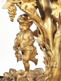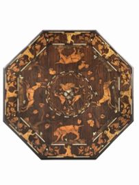 piano ottagonale in palissandro intarsiato in altre essenze pregiate, avorio e madreperla a formare al centro, entro tre ordini di riserve circolari, tre volatili su un ramo; tutto intorno sono intarsiati due cervi e un cane alternati da alberelli, entro un bordo esterno decorato a motivo di putti tra girali fogliacei; base in legno scolpito e dorato foggiata a fusto di albero poggiante su terreno roccioso intorno al quale si avvolgono pampini d’uva, alcuni dei quali sono trattenuti da un putto alato stante accanto all’albero; cm 76x81,5x81,5