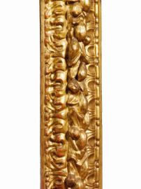 Realizzata in cartapesta dorata, questa cornice si colloca in panorama emiliano. L'alternarsi di frutti con grandi foglie, che si rilevano quasi a tutto tondo al centro della fascia, e la doratura brillante sono una conferma della sua provenienza geografica. Raro il materiale impiegato per la sua realizzazione, così come raro il buono stato di conservazione per un’opera di queste dimensioni.