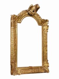 in legno dorato di forma centinata, battuta a baccellatura stilizzata, fascia piatta con fondo inciso a motivi romboidali che si fanno più grandi negli angoli e impreziosita da ramages vegetali a rilievo, con foglie aperte agli angoli entro riserve sagomate, bordo esterno dentellato, parte superiore centrata da aquila ad ali spiegate. Doratura a guazzo in oro zecchino con preparazione a bolo; luce cm 55,5x36,2, ingombro cm 76x52