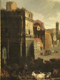 Riproponendo in modo più esteso e completo vedute già note costruite con lo stesso punto di vista, a cui si aggiunge una veduta del Foro verso la torre delle Milizie già a Roma presso la Galleria Megna (vedi L. Salerno, I pittori di vedute in Italia cit., pp. 110-111) il nostro dipinto se ne distingue per proporzioni più ampie e soprattutto per le bellissime figure in primo piano, la cui luminosa cromìa è esaltata da un ottimo stato conservativo.