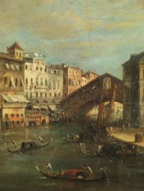 L’inedito dipinto qui offerto propone uno dei soggetti più pittoreschi e ricercati nel genere della veduta veneziana, un’immagine del ponte di Rialto visto da nord e parzialmente celato dal volume poligonale del palazzo dei Camerlenghi; a destra, in ombra, le arcate delle cosiddette Fabbriche Vecchie e dal lato opposto la complessa facciata del Fondaco dei Tedeschi, movimentata anche sotto il profilo cromatico e luministico.