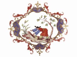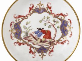 in porcellana, sei tazzine con forma a ciotola su basso piede, una con forma a campana con ansa ad orecchio, piattino circolare con tesa rilevata. Il decoro, detto “alla sassone”, prevede figure orientali e arcadiche inserite entro una riserva polilobata circondata da ornato a rocaille, rabesche e volute, che traggono di ispirazione direttamente dai noti motivi della manifattura di Meissen. Un assortimento simile, ma completo di piattini, è transitato sul mercato in una asta Christie’s a Roma nel 1977, lotto 141; piattino diam. cm 12,5, tazzine alt. cm 5