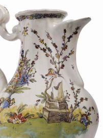 in maiolica, corpo piriforme costolato e baccellato, basso piede baccellato con orlo mosso e base incavata; ansa mistilinea, versatoio “a becco”, coperchio a cupola con presa a bottone. Dipinta a policromia con motivo decorativo detto “al giardino con vaso” o “alla colonna spezzata”: un grande vaso con mazzo di fiori vari sopra un prato fiorito, uccelli in volo e piccoli tralci fioriti decorano il corpo della caffettiera e proseguono sul coperchio, ingentilendo l’ansa e il piede, alt. cm 29