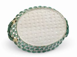 in maiolica, corpo ovoidale, pareti traforate con fioretti a rilievo, prese tortili applicate all’orlo e decorate con fioretti a rilievo. Decoro in policromia con motivo floreale naturalistico al centro e tocchi di verde a impreziosire la forma e le anse. Per forma e decoro si ipotizza ad una attribuzione milanese, alt. cm 12, lungh. cm 39