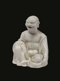 in porcellana acroma. Modello di Böttger, noto come “pagoda”, è raffigurato in posizione a gambe incrociate con la mano destra al ginocchio, il viso caratterizzato da un ampio sorriso e il corpo coperto da una veste fluida che ne lascia scoperto l’addome. Nell’inventario del palazzo giapponese erano indicati presenti 38 modelli di Pagoda bianchi nel 1770; alt. cm 8.
