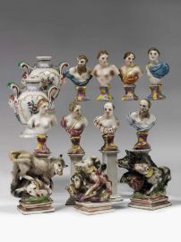 in porcellana plasmati a raffigurare il busto di quattro personaggi classici: il busto di un filosofo, un imperatore romano e due figure femminili. I busti poggiano su basi quadrangolari, sorretti da alti pilastrini. Per materia e tipo di policromia dovrebbero appartenere a una serie più antica rispetto ai quattro bustini presentati al lotto precedenti. Questa tipologia di oggetti faceva parte dei grandi apparati decorativi da tavola realizzati dalla manifattura fiorentina. Per qualità questa seconda serie ricorda lo stile di Giuseppe Bruschi; bustini alt. cm 6, pilastri alt. cm 5,5