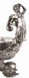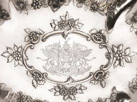 di forma ovale poggiante su quattro piedini modellati come delfini, anse realizzate a tritoni, tesa e piano riccamente sbalzati a fiori, probabilmente in epoca posteriore.Al centro stemma araldico con motto Virtute Tempore, cm 46,5x28,5, g 2505