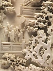 raffinato intaglio a bassorilievo, raffigurante dame e servi in un classico giardino cinese con montagne e nuvole sullo sfondo, pini, acacie e giardini di rocce, dim. cm 13x25, poggiante su base in legno, alt. cm 8