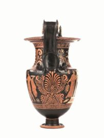 Decorazione: lato A) sotto il labbro meandro ad onda destrorso, sul collo profilo femminile volto a sinistra con kekryphalos, stephane di perle, orecchini e collana che sorge da un fiore ed è circondato da grandi volute e infiorescenze; sul ventre naiskos in bianco con colonne ioniche sotto al quale si trova la figura del defunto, in nudità eroica, seduto a sinistra sul suo mantello, le gambe incrociate, in atto di appoggiarsi alla lancia e sostenere una phiale; alla sua sinistra una giovane donna riccamente abbigliata in atto di offrirgli un unguento contenuto nell’alabastron che sorregge nella mano sinistra mentre nella destra tiene un cembalo; dall’altro lato un giovane nudo volto verso il defunto col mantello drappeggiato sulla spalla e sul torace con strigile nella mano destra e corona nella sinistra; ai lati del podio due grandi patere; lato B) sotto al labbro motivo a chevron, sul collo meandro continuo destrorso e grande palmetta aperta a ventaglio fra volute; sul ventre stele funeraria su podio a cui è legata una tenia nera sormontata da un grande bacile; a sinistra giovane donna riccamente abbigliata con un grappolo d’uva nella mano destra ed un cista e una tenia nella sinistra; dall’altro lato un giovane nudo con mantello drappeggiato sul braccio sinistro che sorregge una phiale mentre nella destra tiene uno specchio e una tenia