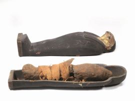 All’interno si conserva un involucro di bende di lino, spezzato in due, che doveva contenere la mummia.