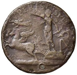 opus Pier Jacopo Alari Bonacoldi detto l’Antico, attivo a Mantova nella metà del XV secolo. Ae fuso mm 40,5 D/ DIVA ANTONIA BAVTIA DE GONZ MA R Busto a destra R/ SVPEREST M SPES Donna alata su navicella trainata sulle onde da due pegasi guidati da amorino. Armand I, p. 42 Hill 212 MB foro otturato