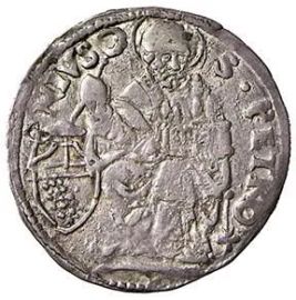 Ag D/ BONONIA DOCET Nel campo stemma semiovale di Bologna inquartato nel I e IV dall’arma crociata e nel II e III da quella con il motto LIBERTAS, cimasa fogliata e fiore R/ S PETRO NIVS Nel campo santo seduto con la città nella mano sinistra e pastorale nella destra Chim. 288 Raro q.SPL