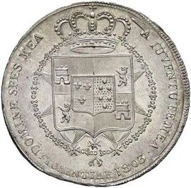 Ag D/ CAROLVS LVD D G REX ETR & M ALOYSIA R RECTRIX I I H H Busti accollati a d. Sotto segno dell’incisore e dello zecchiere R/ DOMINE SPES MEA A IUVENTUTE MEA Stemma partito, coronato, circondato dal collare del Toson d’oro da cui pendono tre insegne di ordini cavallereschi. Sotto FLORENTIAE 1803. Sul taglio LIRE CINQUE. Luigi Sieries incisore dei conii (LS in nesso). Giovanni Fabbroni zecchiere (martello).