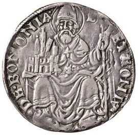 Ag D/ BONONIA MATER STVDIORVM Nel campo leone rampante con stemma Bentivoglio poligonale R/ S PETRONIV DE BONONIA Nel campo santo seduto che regge la città nella mano destra Chim. 194 SPL