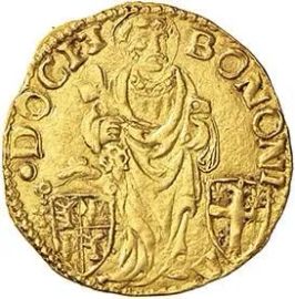 Au D/ IVLIVS II PONT MAX Nel campo stemma decagono del pontefice sovrapposto alle chiavi decussate e sormontato da tiara in quadribolo R/ BONONI A DOCET Nel campo San Pietro stante con stemma Alidosi sormontato dal galero cardinalizio a sinistra e quello crociato di Bologna a destra Chim. 237 Munt. 84 BB+