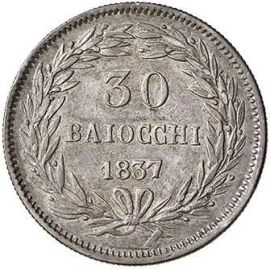 Ag D/ GREGORIVS XVI PONT MAX N VI Nel campo busto a s. del pontefice. Sotto B NC R/ In corona d’ulivo 30 / BAIOCCHI / 1836 Chim. 1302 Munt. 30a SPL Raro